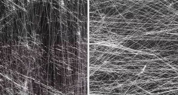 右图为双宫桑蚕丝,纵横交错,丝质细密。